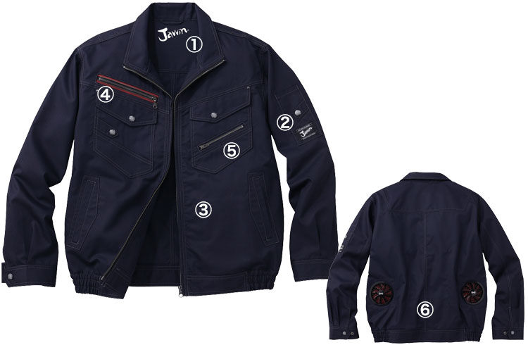 男気あふれる長袖空調服®のセット。レッドファスナーやデザインボタンなど細部のデザインがかっこよく、作業着として人気が高いJawinの56000シリーズのデザインをベースにしています。