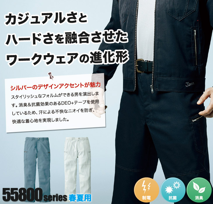 55800シリーズ,自重堂,春夏,ノータックカーゴパンツ,カーゴパンツ,Jawin,JAWIN,かっこいい,シックブラック,ミストブルー,シルバー,建設,建築,鉄鋼,機械,営業,配達,運送,倉庫,大工