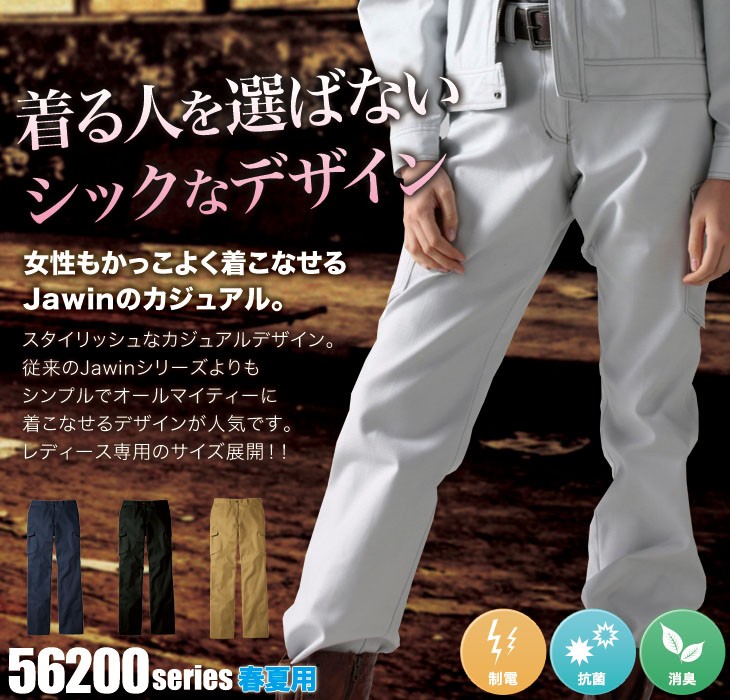 56216シリーズ,自重堂,春夏,パンツ,カーゴパンツ,レディース,おしゃれ,カッコイイ,かっこいい,Jawin,JAWIN,ネービー,キャメル,シルバー,ブラック,消臭,抗菌,建設,建築,大工,