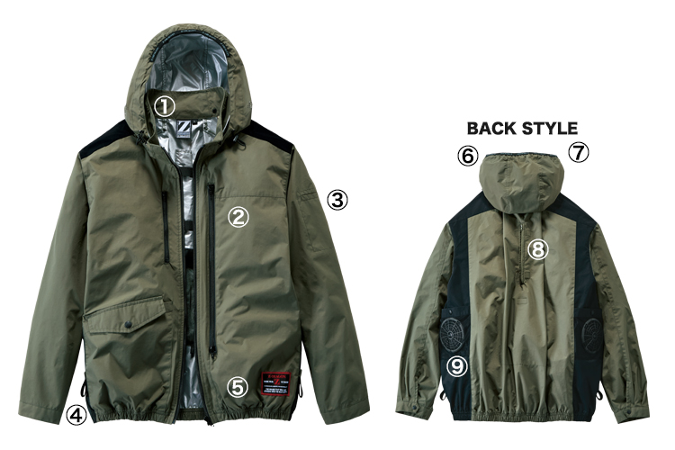 フルハーネスに対応した、サイドファンタイプの空調服®。裏地にアルミコーティングを施しUVカットと-10℃の遮熱効果を実現し、より涼しい長袖ブルゾン。