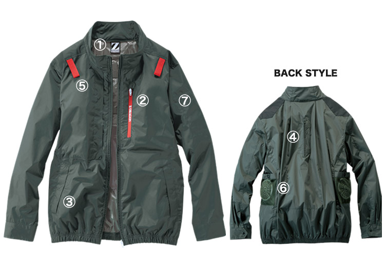 - フルハーネス対応、サイドファン、ペン差し、メッシュポケット、左胸ファスナーポケット
