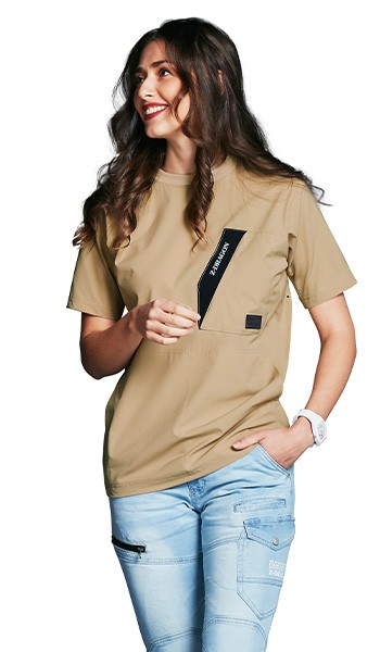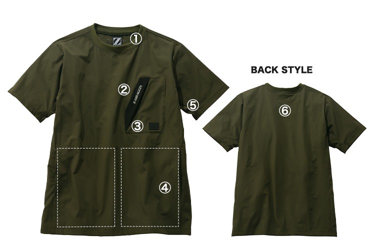 両脇に大型ポケットがついておりTシャツには珍しい高い収納力。胸のファスナー付きポケットはカジュアルなデザインのアクセントにもなっています。