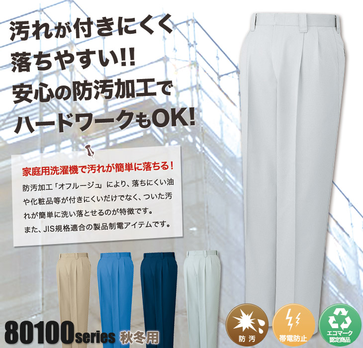 作早2015AW,スラックス,大工,80100,パンツ,ベージュ,ネービー,ライトブルー,シルバー,アースグリーン,JI,秋冬,製品制電,JIS T8118,エコ,防汚加工
