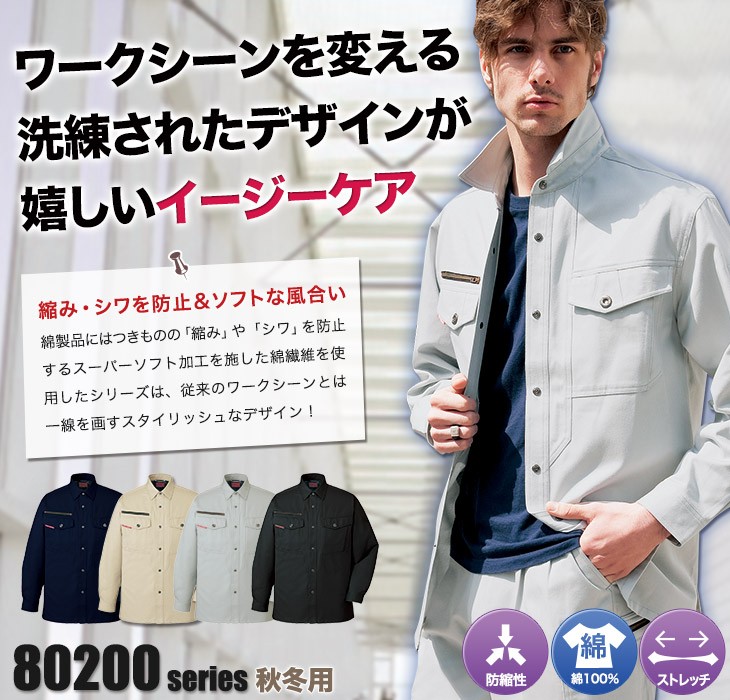 作早2015AW,大工,80200,長袖シャツ,自重堂,秋冬,,綿100%,かっこいい,防縮防シワ加工,ストレッチ,スーパーソフト加工,ネービー,アイボリー,アースグリーン,シルバーグレー,シックブラック,鉄工,機械,鐵工,溶接,建設,建築