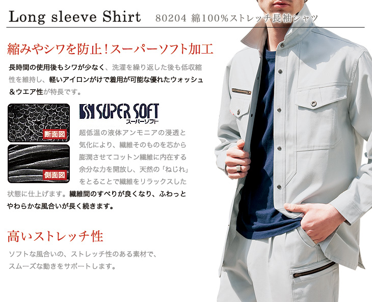 作早2015AW,大工,80200,長袖シャツ,自重堂,秋冬,,綿100%,かっこいい,防縮防シワ加工,ストレッチ,スーパーソフト加工,ネービー,アイボリー,アースグリーン,シルバーグレー,シックブラック,鉄工,機械,鐵工,溶接,建設,建築