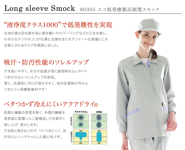 作早2015AW,80300,長袖シャツ,自重堂,秋冬,スモック,女性用,レディース,低発塵,清浄度クラス1000,帯電防止,JIS,T8118,防汚加工,吸汗速乾,エコマーク・F定,グリーン購入法対応,ペアコーディネート,ケミカルリサイクル,アクアドライ,ソレルアップ,サックス,シルバー,スプレーグリーン,ローズピンク,製造,工場,精密,
