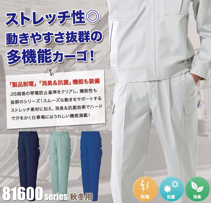 作早2015AW,81600,自重堂,秋冬,カーゴパンツ,帯電防止,制電,JIS T8118,消臭,抗菌,ストレッチ,ネービー,シルバー,アースグリーン,ロイヤルブルー,電気,設備,運送,倉庫,清掃,ビルメン