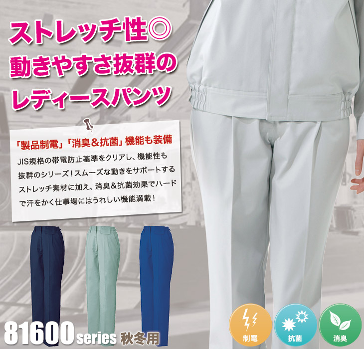 作早2015AW,スラックス,81600,自重堂,秋冬,パンツ,スラックス,帯電防止,制電,JIS T8118,消臭,抗菌,ストレッチ,ペアコーディネート,男女兼用,女性用,ネービー,シルバー,アースグリーン,ロイヤルブルー,電気,設備,運送,倉庫,清掃,ビルメン