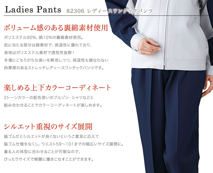 82300シリーズ,おしゃれ,秋冬用,パンツ,ズボン,自重堂,かっこいい,ネービー,シルバー,アースグリーン,シックブラック,女性用