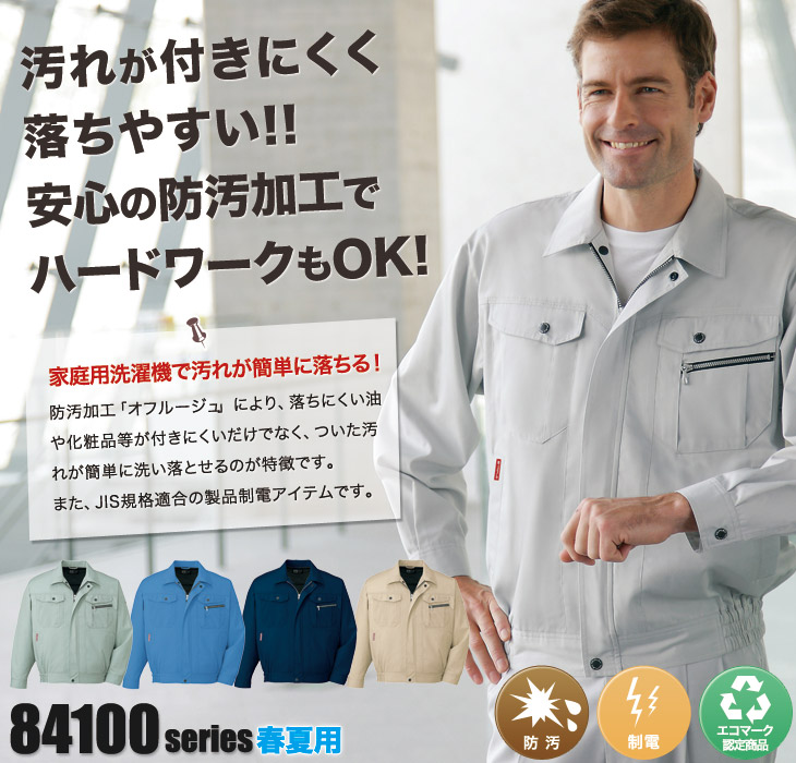84100,長袖ブルゾン,防汚加工,帯電防止,JIS,T-8118,エコマーク認定,グリーン購入法,ペアコーディネート,オフルージュ,ベージュ,ネービー,ライトブルー,シルバー,アースグリーン,SS,5L,男女兼用,建設,建築,鉄鋼,機械,電機,設備,運送,倉庫,営業,配達,