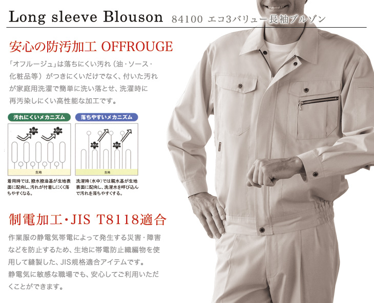 84100,長袖ブルゾン,防汚加工,帯電防止,JIS,T-8118,エコマーク認定,グリーン購入法,ペアコーディネート,オフルージュ,ベージュ,ネービー,ライトブルー,シルバー,アースグリーン,SS,5L,男女兼用,建設,建築,鉄鋼,機械,電機,設備,運送,倉庫,営業,配達,