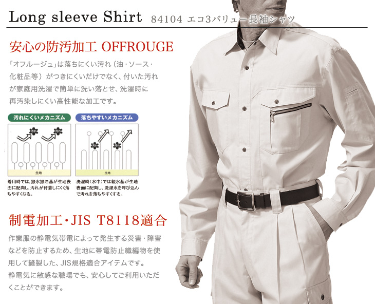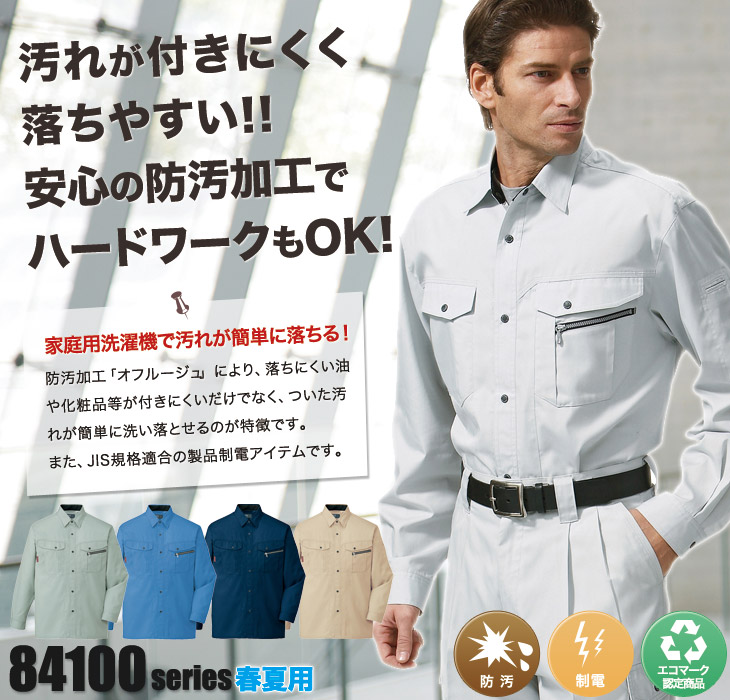 大工,84100,80100,長袖シャツ,自重堂,春夏,,防汚加工,帯電防止,JIS,T-8118,エコマーク認定,グリーン購入法,ペアコーディネート,オフルージュ,ベージュ,ネービー, ライトブルー,シルバー,アースグリーン,SS,5L,男女兼用,建設,建築,鉄鋼,機械,電機,設備,運送,倉庫,営業,配達,