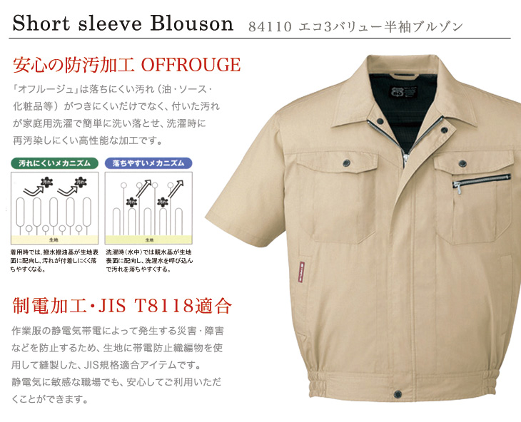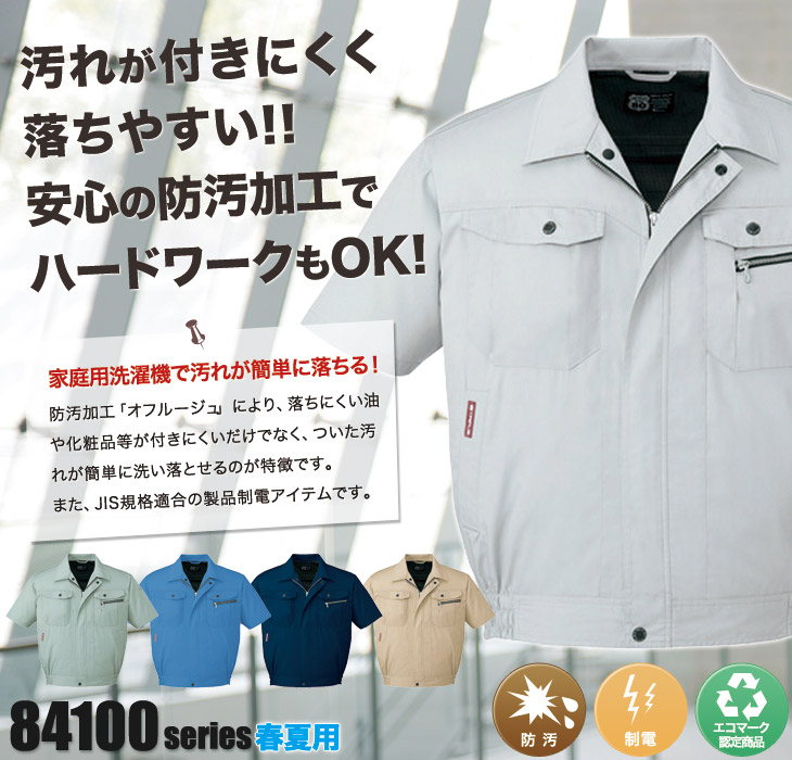 84100,半袖ブルソン,防汚加工,帯電防止,JIS,T-8118,エコマーク認定,グリーン購入法,ペアコーディネート,オフルージュ,ベージュ,ネービー,ライトブルー,シルバー,アースグリーン,SS,5L,男女兼用,建設,建築,鉄鋼,機械,電機,設備,運送,倉庫,営業,配達,