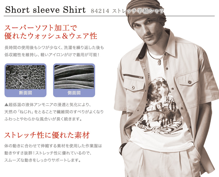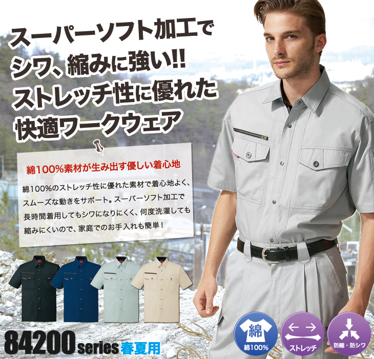 84200,かっこいい,半袖シャツ,自重堂,春夏,ネービー,アイボリー,アースグリーン,シルバーグレー,シックブラック,ストレッチ,ソフト加工,防縮防シワ加工,綿100%,5L,鉄鋼,溶接,鉄工所,機械,大工