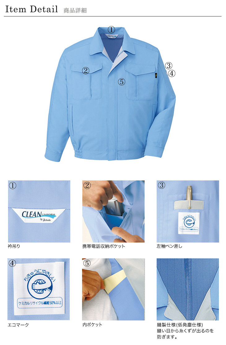 [春夏用]エコ低発塵製品制電長袖ブルゾン[JIS T8118適合][男女兼用](01-84300)