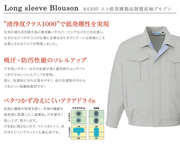 84300,長袖ブルゾン,自重堂,春夏,低発塵,帯電防止,JIS,T8118,防汚加工,吸汗速乾,エコマーク,グリーン購入法,ペアコーディネート,リサイクル,清浄度クラス1000,サックス,シルバー,スプレーグリーン,ローズピンク,アクアドライ,ソレルアップ,SS,5L,精密,電機,設備