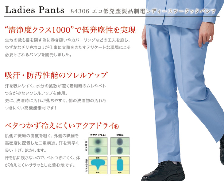 84300,パンツ,自重堂,春夏,ツータック,スラックス,女性用,レディース,低発塵,帯電防止,JIS,T8118,防汚加工,吸汗速乾,エコマーク,グリーン購入法,ペアコーディネート,リサイクル,清浄度クラス1000,サックス,シルバー,スプレーグリーン,ローズピンク,アクアドライ,ソレルアップ,5L,精密,電機,設備