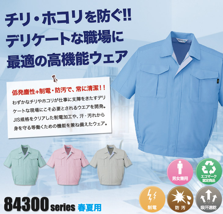 84300,半袖ブルソン,自重堂,春夏,低発塵,帯電防止,JIS,T8118,防汚加工,吸汗速乾,エコマーク,グリーン購入法,ペアコーディネート,リサイクル,清浄度クラス1000,サックス,シルバー,スプレーグリーン,ローズピンク,アクアドライ,ソレルアップ,SS,5L,精密,電機,設備