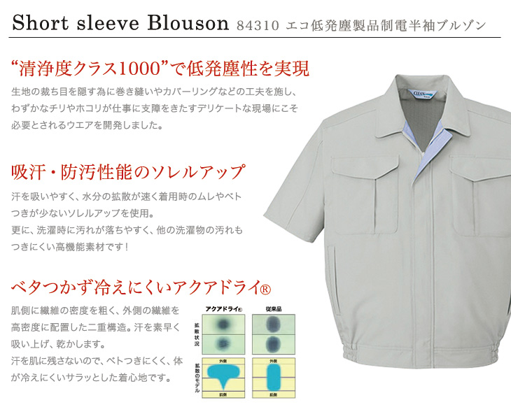 84300,半袖ブルソン,自重堂,春夏,低発塵,帯電防止,JIS,T8118,防汚加工,吸汗速乾,エコマーク,グリーン購入法,ペアコーディネート,リサイクル,清浄度クラス1000,サックス,シルバー,スプレーグリーン,ローズピンク,アクアドライ,ソレルアップ,SS,5L,精密,電機,設備