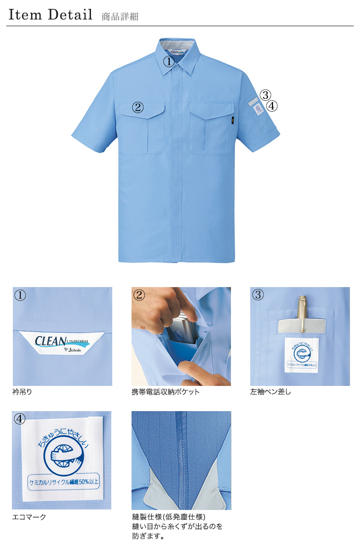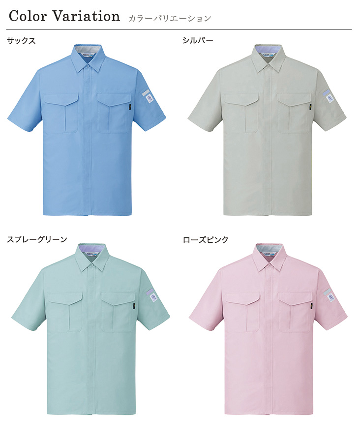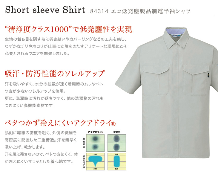 84300,半袖シャツ,自重堂,春夏,低発塵,帯電防止,JIS,T8118,防汚加工,吸汗速乾,エコマーク,グリーン購入法,ペアコーディネート,リサイクル,清浄度クラス1000,サックス,シルバー,スプレーグリーン,ローズピンク,アクアドライ,ソレルアップ,SS,5L,精密,電機,設備