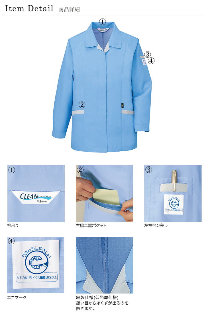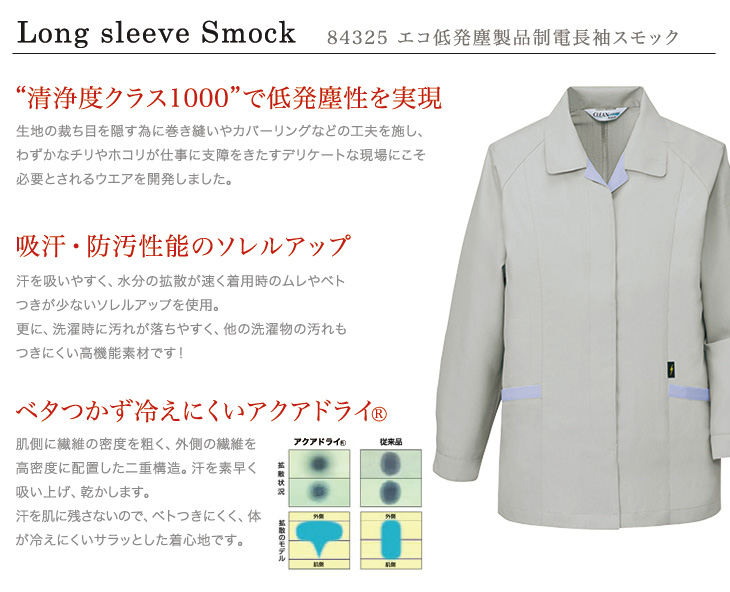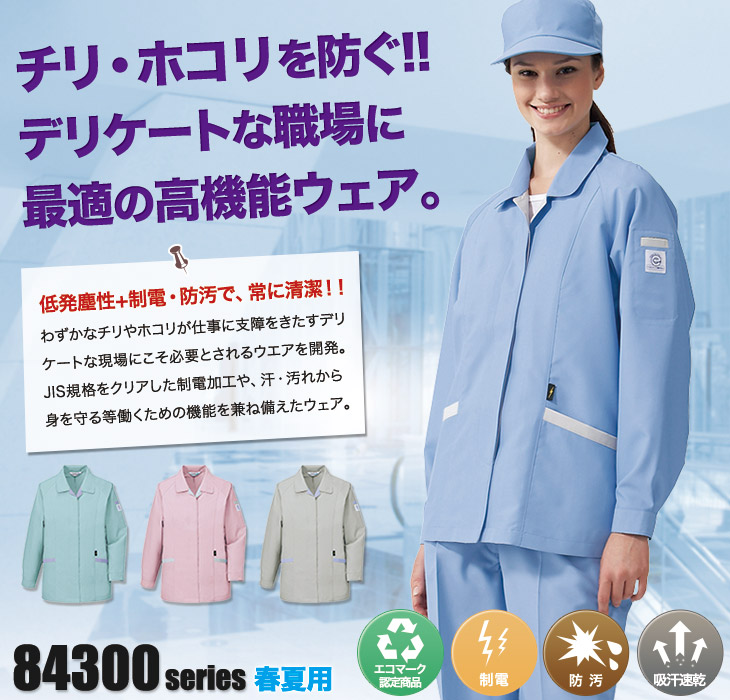 84300,長袖シャツ,自重堂,春夏,スモック,女性用,レディース,低発塵,帯電防止,JIS,T8118,防汚加工,吸汗速乾,エコマーク,グリーン購入法,ペアコーディネート,リサイクル,清浄度クラス1000,サックス,シルバー,スプレーグリーン,ローズピンク,アクアドライ,ソレルアップ,5L,精密,電機,設備