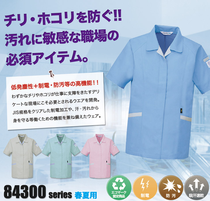 84300,半袖シャツ,自重堂,春夏,スモック,女性用,レディース,低発塵,帯電防止,JIS,T8118,防汚加工,吸汗速乾,エコマーク,グリーン購入法,ペアコーディネート,リサイクル,清浄度クラス1000,サックス,シルバー,スプレーグリーン,ローズピンク,アクアドライ,ソレルアップ,5L,精密,電機,設備