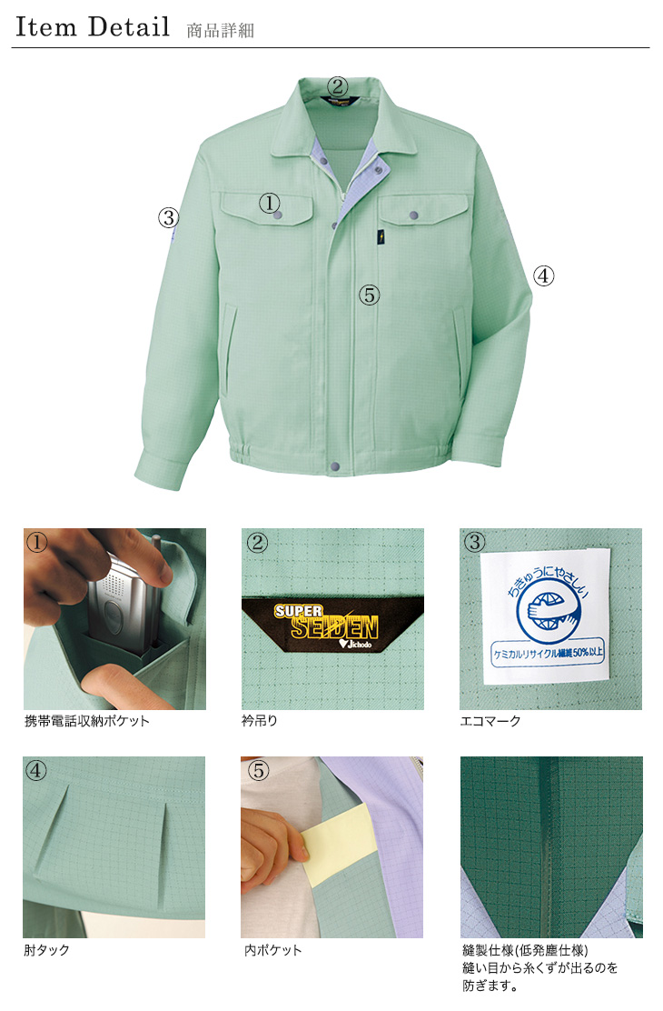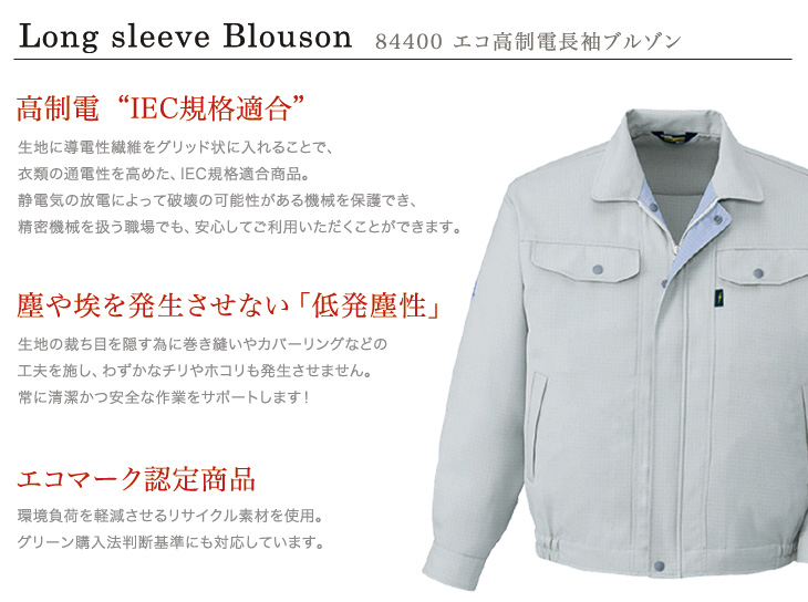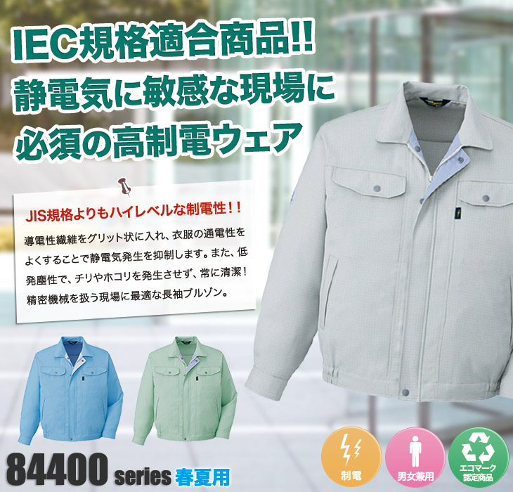 84400,長袖ブルゾン,自重堂,春夏,低発塵,製品制電,JIS,T8118,帯電防止,エコマーク,グリーン購入法,洗浄度クラス1000,ケミカルリサイクル,ペアコーディネート,サックス,シルバー,スプレーグリーン,IEC規格適合,61340‐5-1,SS,5L,精密