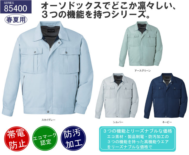 85400シリーズ,制電,長袖ブルゾン,自重堂,春夏,ジャンパー,防汚加工,JIS T8118, 帯電防止,エコマーク認定,グリーン購入法,ネービー,シルバー,アースグリーン,スカイグレー,オフルージュ,リサイクル素材,5L,農業,鉄鋼,機械,電機,設備,運送,倉庫,営業,配達