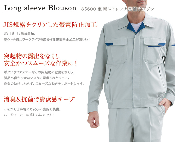 85600,長袖ブルゾン,自重堂,春夏,製品制電,帯電防止,JIS T8118, 消臭,抗菌,ストレッチ,ペアコーディネート,ネービー,シルバー,アースグリーン,ロイヤルブルー,SS,5L,ビルメンテナンス,清掃,電機,設備,運送,倉庫