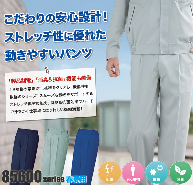 スラックス,85600,パンツ,自重堂,春夏,ワンタック,スラックス,脇ゴム,製品制電,帯電防止,JIS T8118, 消臭,抗菌,ストレッチ,ペアコーディネート,ネービー,シルバー,アースグリーン,ロイヤルブルー,5L,ビルメンテナンス,清掃,電機,設備,運送,倉庫