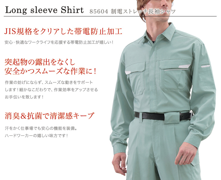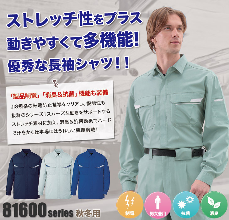85600,81600,長袖シャツ,自重堂,春夏,製品制電,帯電防止,JIS T8118, 消臭,抗菌,ストレッチ,ペアコーディネート,ネービー,シルバー,アースグリーン,ロイヤルブルー,SS,5L,ビルメンテナンス,清掃,電機,設備,運送,倉庫