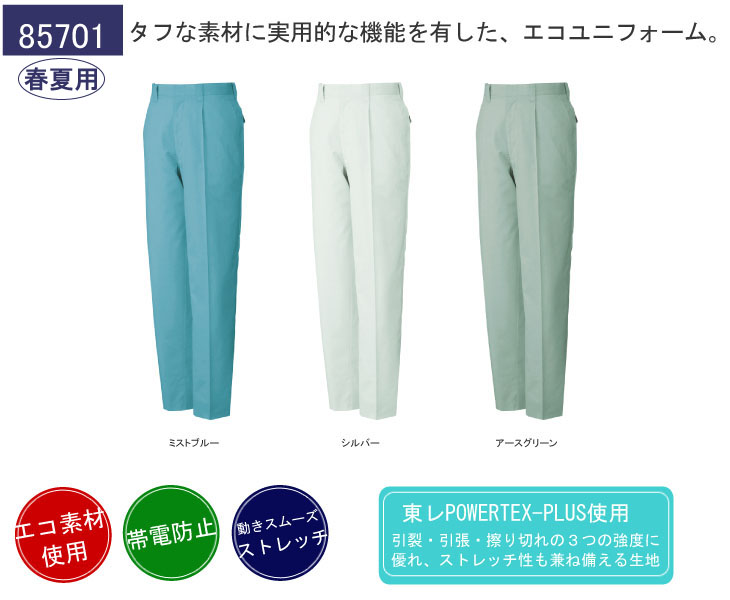 スラックス,85700,パンツ,自重堂,春夏,ワンタック,エコマーク,グリーン購入法,ストレッチ,JIS T8118, 帯電防止,ウィングアーム,タフ素材,ベンチレーション,通気性,シルバー,アースグリーン,ミストブルー,東レ,パワーテックス,丈夫,破れにくい,伸びる,建設,建築,運送,倉庫,農業