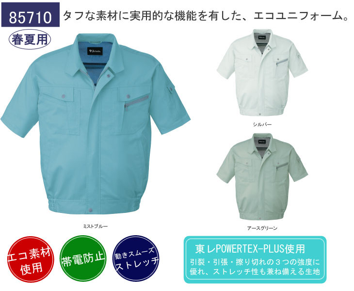 85700,半袖ブルソン,自重堂,春夏,エコマーク,グリーン購入法,ストレッチ,帯電防止,JIS T8118, ウィングアーム,タフ素材,ベンチレーション,通気性,シルバー,アースグリーン,ミストブルー,東レ,パワーテックス,丈夫,破れにくい,伸びる,建設,建築,運送,倉庫,農業