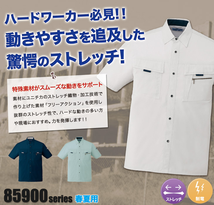 85900,半袖シャツ,自重堂,春夏,ネービー,シルバー,アースグリーン,まるごとストレッチ,ストレッチ素材,帯電防止