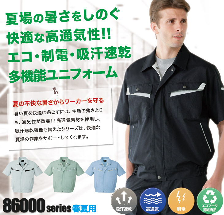 86000シリーズ,JIS,自重堂,春夏,半袖ブルゾン,帯電防止,吸汗速乾,清涼機能素材,エコマーク認定,グリーン購入法,ライトブルー,シルバー,アースグリーン,シックブラック,建設,建築,営業,配達,電気,設備,運送,倉庫