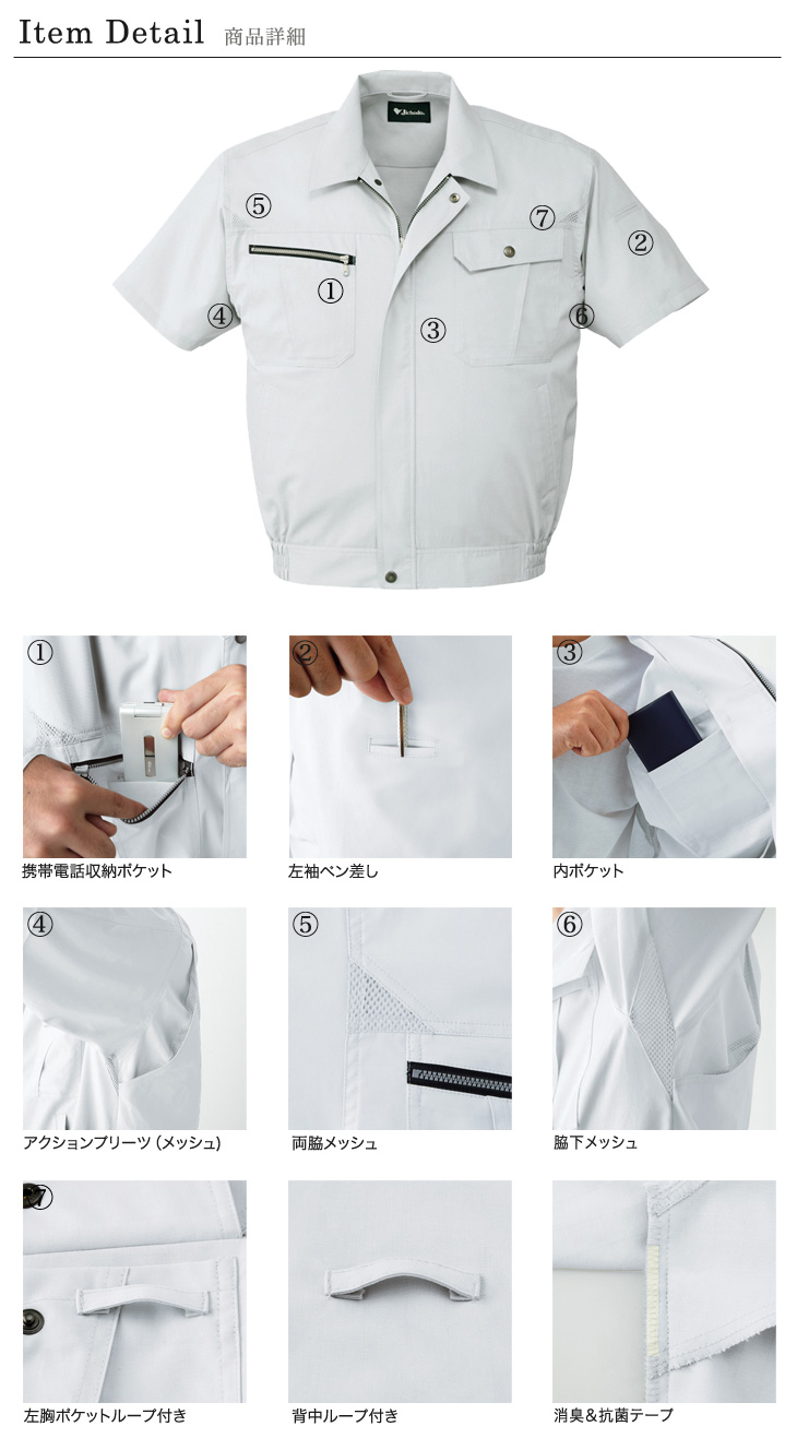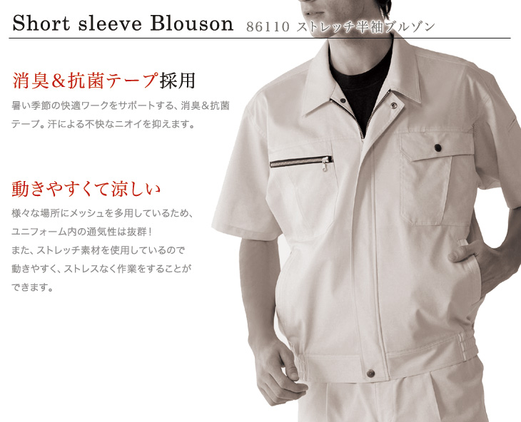 86100シリーズ,自重堂,春夏,半袖ブルゾン,建設,建築,営業,配達,電気,機械,運送,倉庫,ネービー,シルバー,アースグリーン,クールビズ対応,ストレッチ,消臭,抗菌,帯電防止,