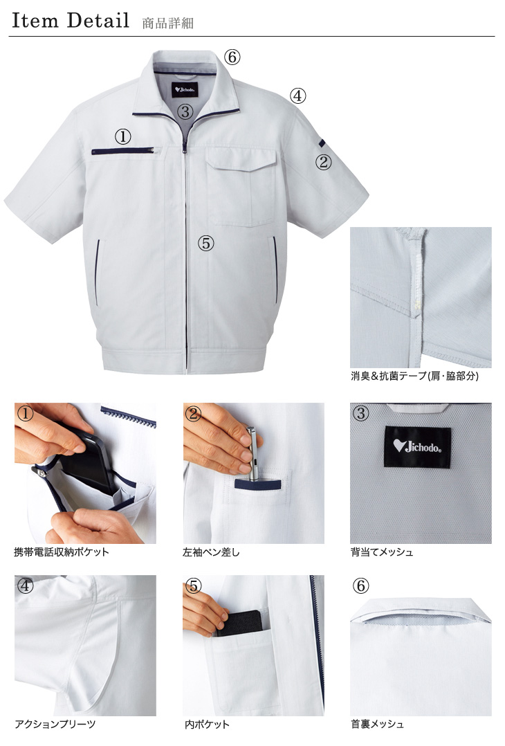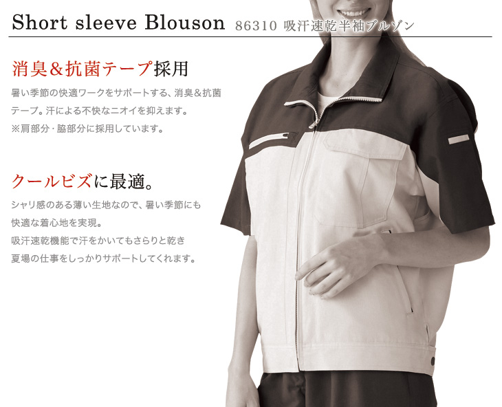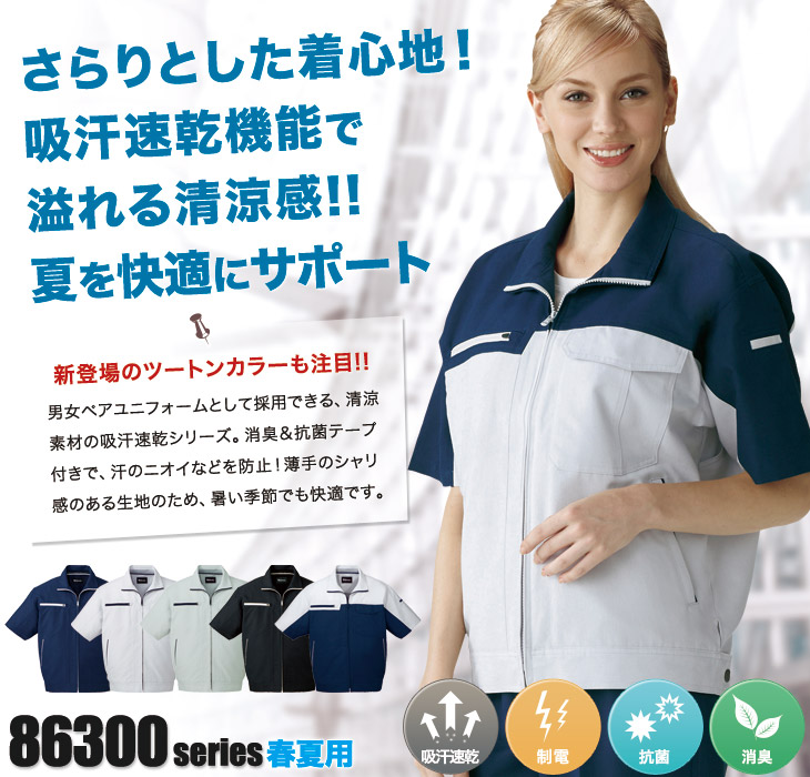 86300シリーズ,自重堂,春夏,半袖ブルゾン,帯電防止,吸汗速乾,消臭,抗菌,クールビズ,ネービー,シルバー,アースグリーン,シックブラック,営業,配達,建設,建築,運送,倉庫