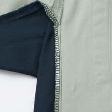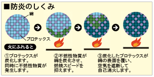 難燃繊維「プロテックス」を使用し、素材自身に優れた自己消火機能があります。 日に触れても炭化するだけで延焼せず、しかも熱で溶けたり縮んだりしないため肌に付着しにくく安全です。 洗濯後も難燃性や制電性が持続する「耐洗濯性」にも優れています。