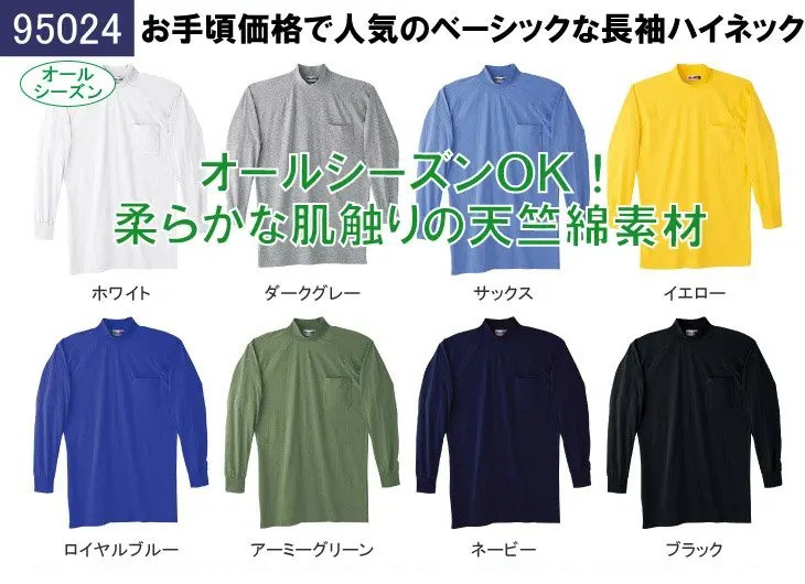 綿100%(ダークグレーは綿高混)の柔らかく肌触りバツグンの素材。人気の長袖ハイネックシャツ。