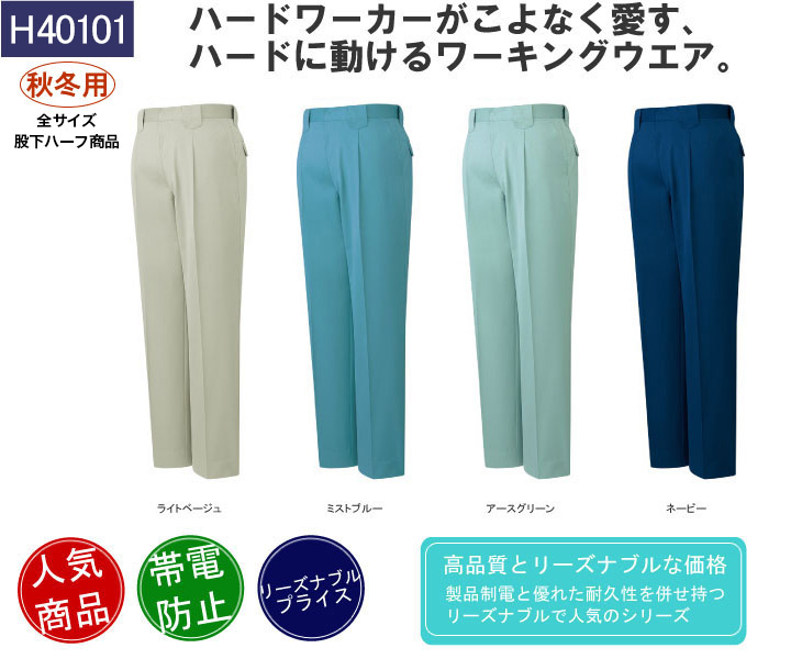 作早2015AW,スラックス,40100,パンツ,自重堂,秋冬,ワンタック,帯電防止,アースグリーン,ライトベージュ,ミストブルー,ネービー,JIS T8118,建設,建築,営業,配達,股下ハーフ