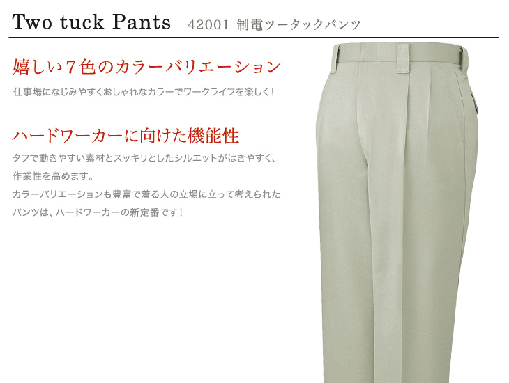 作早2015AW,42000,パンツ,自重堂,秋冬,ツータック,帯電防止,制電,安い,アースグリーン,ライトベージュ,マスタード,ミストグリーン,ブルーノート,ブルーグレー,ネービー,建設,土木,電気,設備,運送,倉庫,営業,配達,股下ハーフ