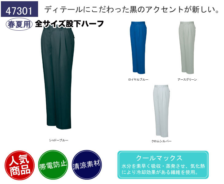 スラックス,47300,パンツ,自重堂,春夏,ツータックパンツ,アースグリーン,ロイヤルブルー,クロムシルバー,シャドーブルー,ソフトバーバリー,クールマックス,帯電防止,FIELD MESSAGE,ハード,耐久性,しなやか,リーズナブル,黒,建設,建築,営業,配達