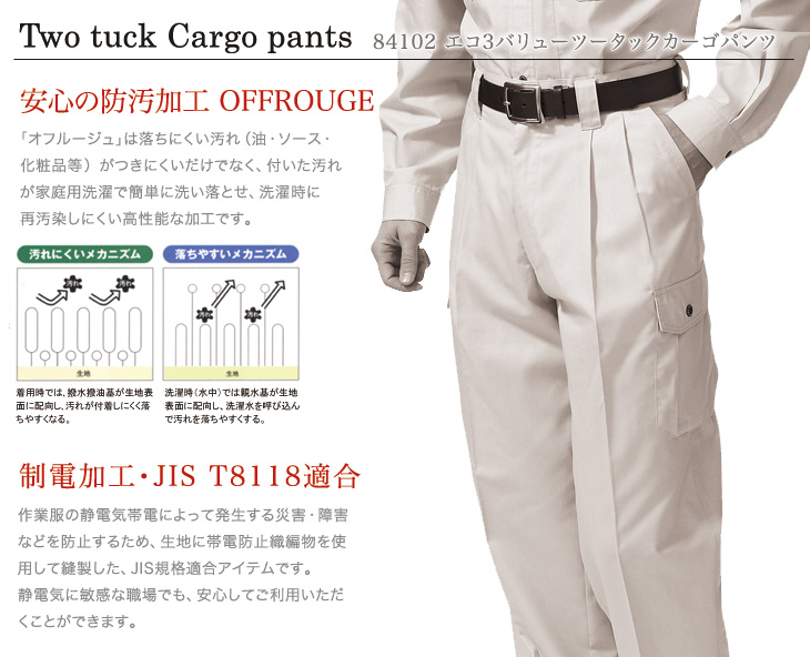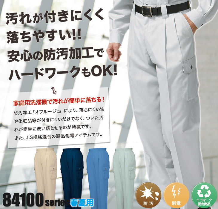84100,カーゴパンツ,自重堂,春夏,ツータック,防汚加工,帯電防止,JIS,T-8118,エコマーク認定,グリーン購入法,オフルージュ,ベージュ,ネービー,ライトブルー,シルバー,アースグリーン,建設,建築,鉄鋼,機械,電機,設備,運送,倉庫,営業,配達,