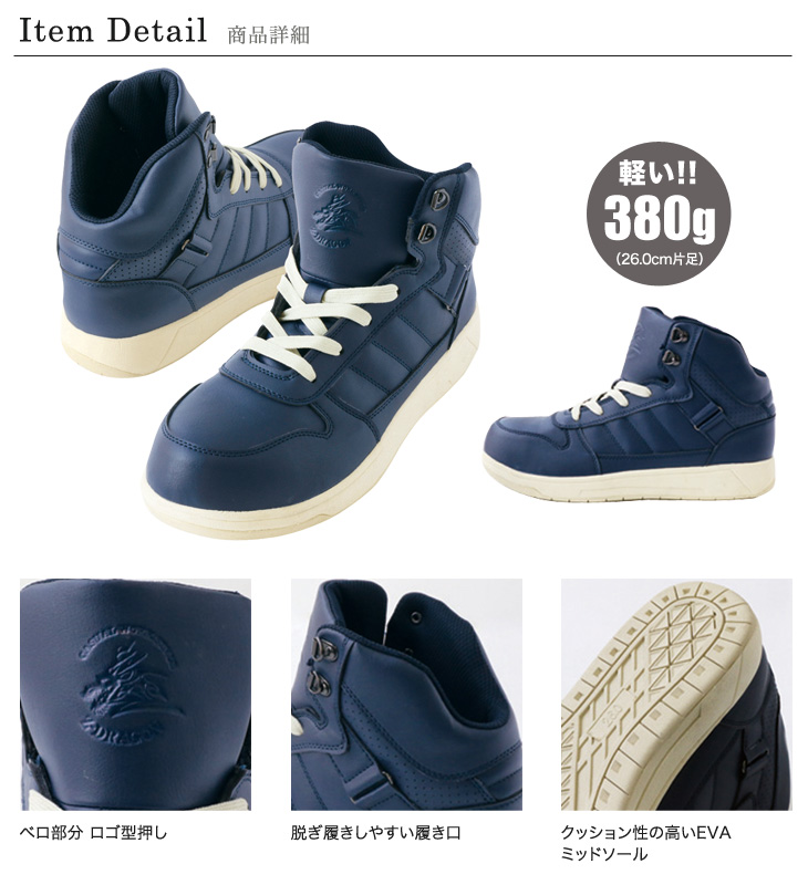 - アッパー:合成皮革、ミッドソール:EVA、アウトソール:合成ゴム(耐油ラバー)、先芯:樹脂芯
