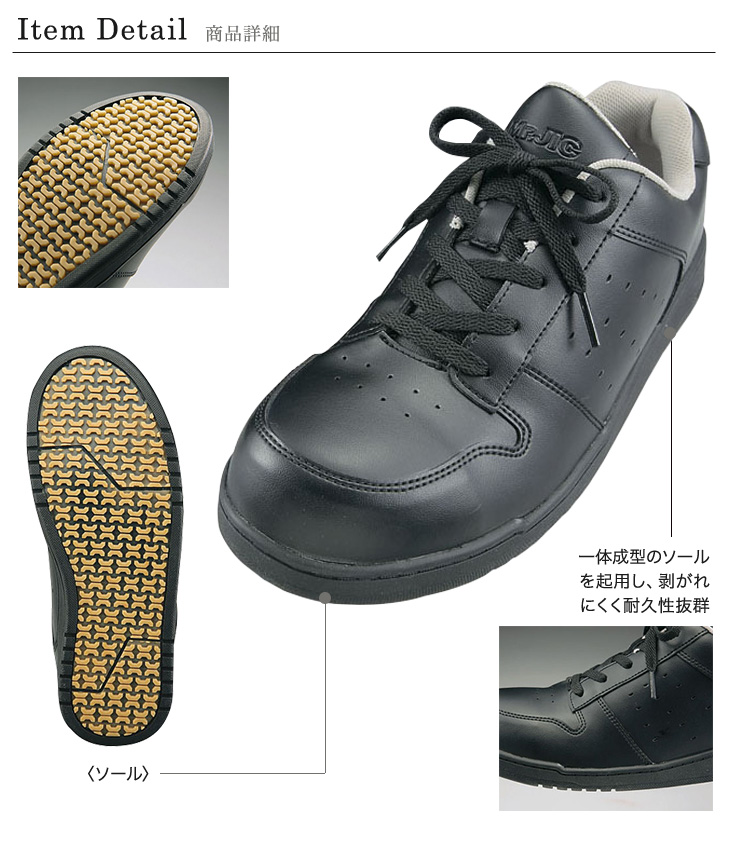 - アッパー:合皮、ミッドソール:合成樹脂、アウトソール:耐油ラバー、先芯:樹脂芯、ウィズ:EEE(~24cm)、EEEE(24.5cm~)、重量:400g(26.0cm片足)
