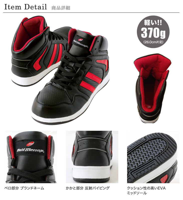 - アッパー:合成皮革、ミッドソール:EVA、アウトソール:耐油ラバー、先芯:樹脂芯
