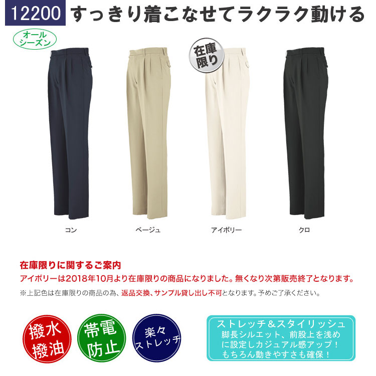 スラックス,カジュアル,パンツ,ツータック,ジーベック,ストレッチ,帯電防止,形態安定,男女ペア,コン,ネービー,ベージュ,アイボリー,クロ,イベント,軽作業,運送,倉庫,営業,配達