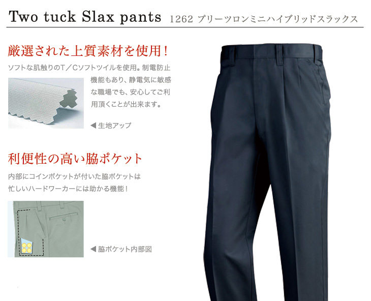 スラックス,1260,パンツ,ジーベック,秋冬用,1260シリーズ,プリーツロンMINIハイブリッド,帯電防止,ソフト,建築,建設,電気,設備,農業,運送,倉庫,営業,配達