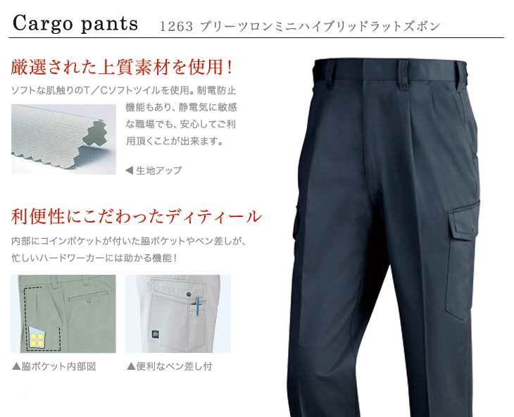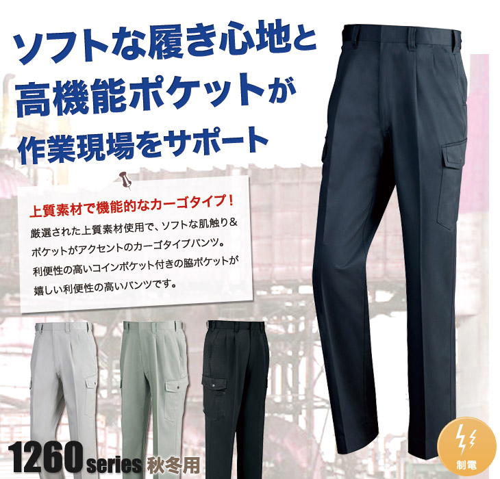 1260,カーゴパンツ,ジーベック,秋冬用,1260シリーズ,プリーツロン,MINI,ハイブリッド,帯電防止,ソフト,建築,建設,電気,設備,農業,運送,倉庫,営業,配達