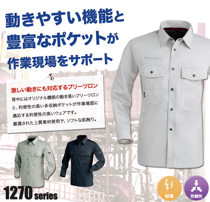 1260,長袖シャツ,ジーベック,春夏用,1270シリーズ,プリーツロンMINIハイブリッド,帯電防止,ソフト風合い,防縮、防シワ,年間対応,メッシュプリーツロン,グレー,チャコールグレー,モスグリーン,建設,建築,電機,設備,営業,配達
